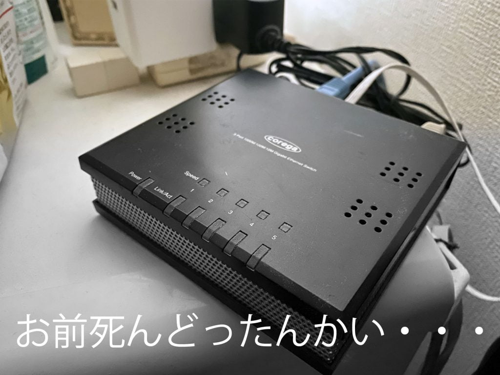 このHUBは回線のある部屋、サーバーのある部屋、寝室の間の接続のため隠し置いてあり、寝室のLANは全く使っていないので気付かなかった。