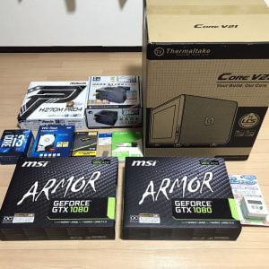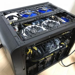 マザー上にGTX1080とGTX1060を挿し、ライザーカードを使ってGTX1080を1基ケース上部に吊り下げ固定。なかなかカッコイイ感じに出来上がりました。