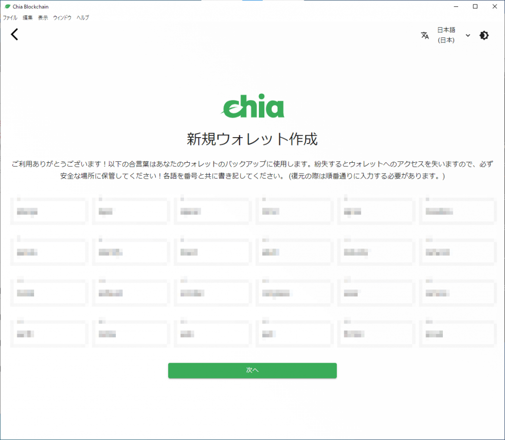 新規ウォレット作成という画面で、24個ものキーが表示されます。