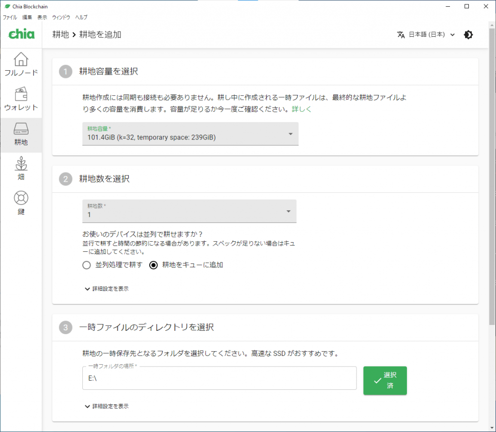 耕地容量を選択出来ますが、101.4GBで作るのが良いそうです。